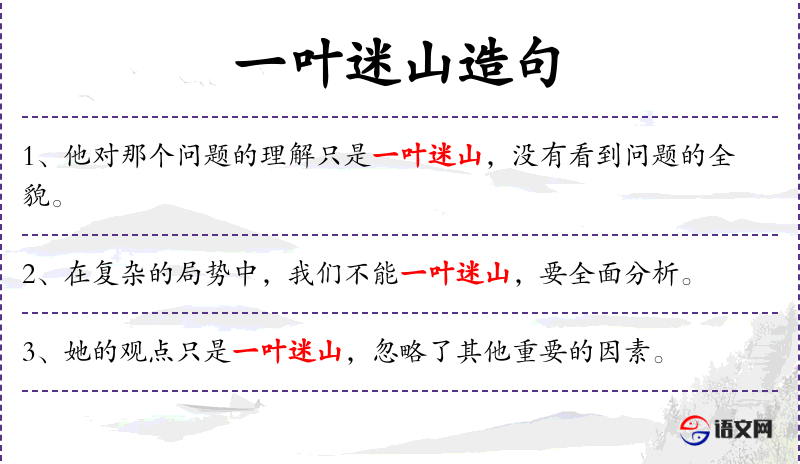- 一叶迷山:成语,比喻只看到局部而忽视整体。