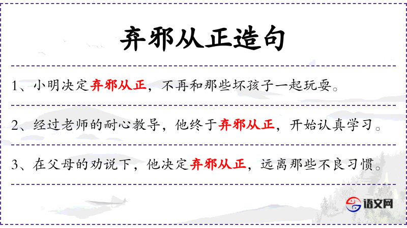“弃邪从正”是一个成语,源自**传统文化,强调改正错误,回归正道。这与社会主义核心价值观中的“公正、法治、诚信、友善”相契合。