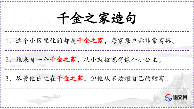 - 宾语:无直接宾语,但“在千金之家”作为地点状语,补充了动作发生的地点。