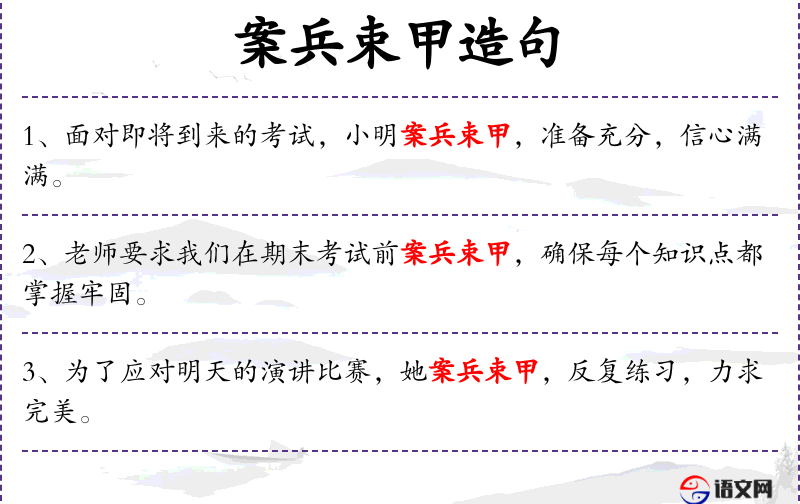 4. 【案兵束甲】 - 放下兵器,捆束铠甲。指停止作战。