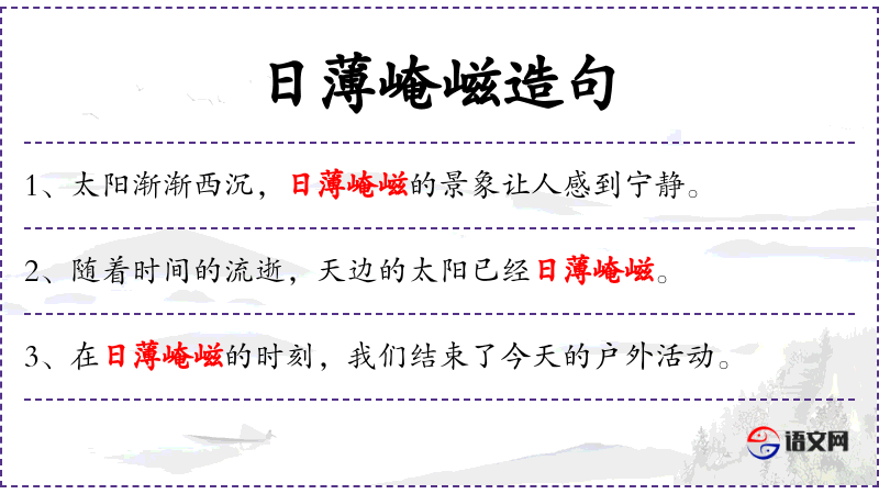 4. 【日薄崦嵫】 日:指太阳;薄:迫近;崦嵫:山名,在今甘肃省天山县西,古指太阳落下的地方。太阳迫近崦嵫山。比喻人已到暮年或事物已到尽头。