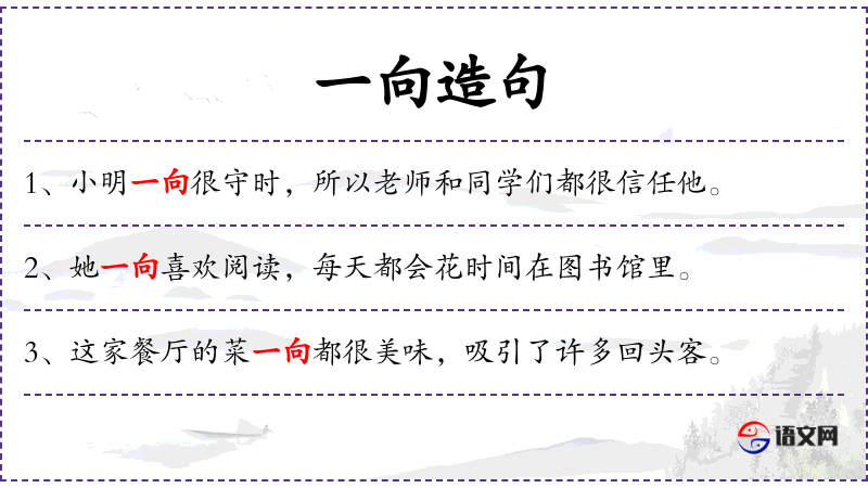 朝着一个方向蓄力待时,并兵一向; 一味;一意自是君恩薄如纸,不须一向恨丹青; 一片烟波一向离愁; 指过去或近来一段时间你一向在何处? 5.副词。一直;从来他为人一向如此|一向爱好体育|生活一向很俭朴。