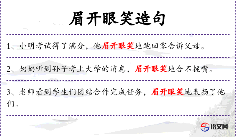 4. 【眉开眼笑】 - 眉头舒展,眼含笑意。形容高兴愉快的样子。