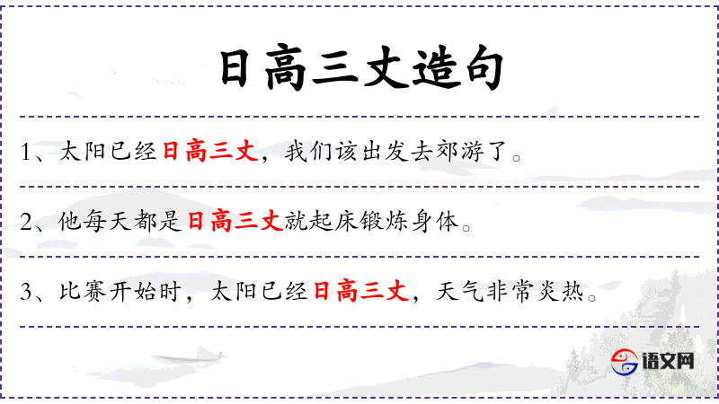 - 日高三丈:这个成语反映了**传统文化中对时间的描述方式。