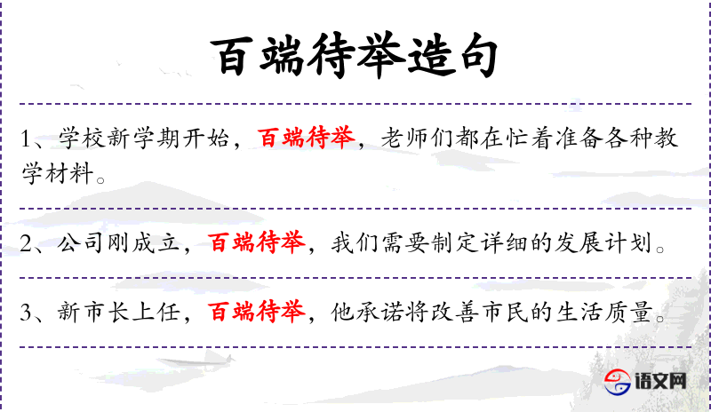 3. 【百端待举】 面端:百种;举:举办。有很多事情等着要兴办。