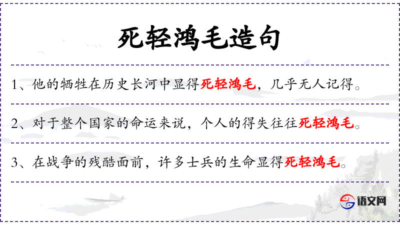 5. 【死轻鸿毛】 鸿毛:鸿雁的毛,比喻轻微不足道。人的死比大雁的毛还轻。比喻毫无价值。