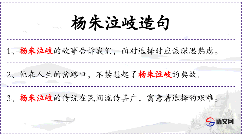 1. 【杨朱泣岐】 - 常引作典故,用来表达对世道崎岖,担心误入歧途的感伤忧虑,或在歧路的离情别绪。