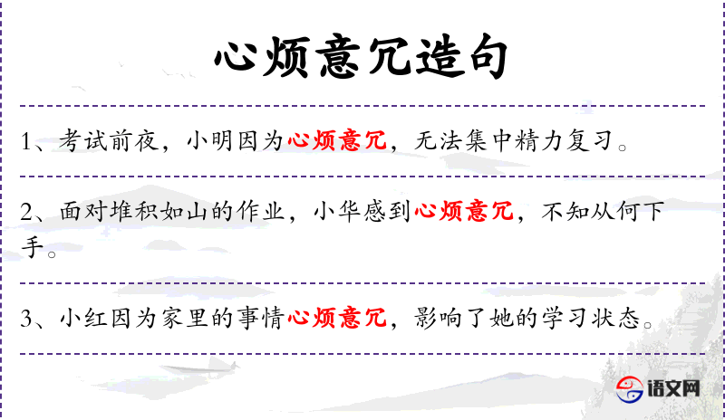 - 心烦意冗:形容词短语,表示心情烦躁,思绪纷乱。