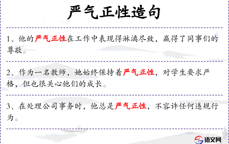 - 严气正性:形容词短语,表示严格、正直的性格。
