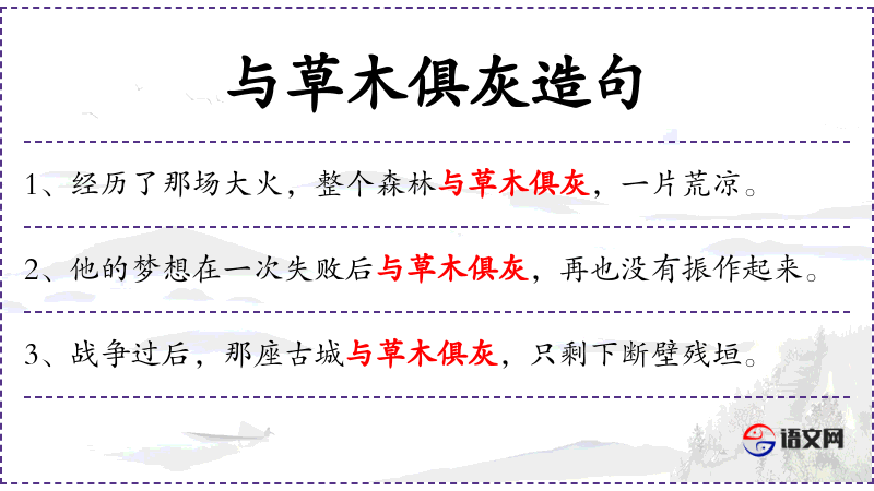 1. 【与草木俱灰】 俱:全,都。和草木一起变成灰。形容人生前无所作为,死后也默默无闻。