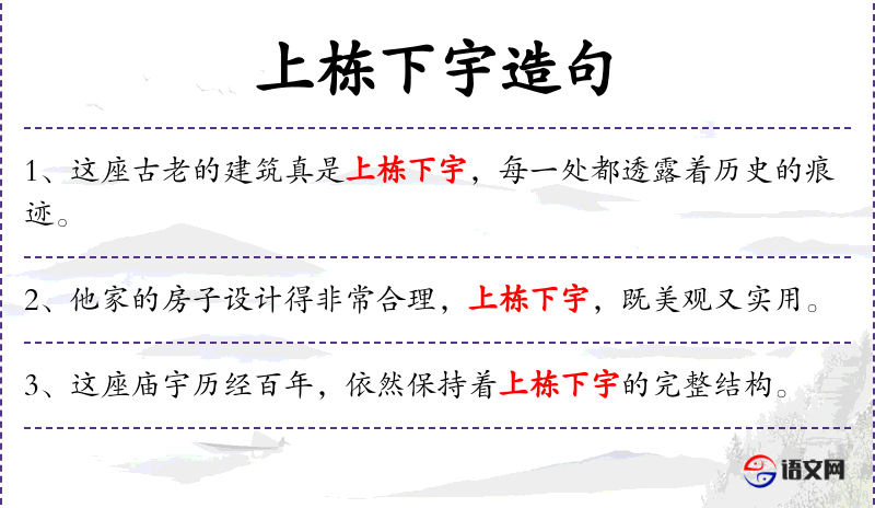 1. 【上栋下宇】 - 《易.系辞下》"上古穴居而野处,后世圣人易之以宫室,上栋下宇,以待风雨,盖取诸大壮。"后用以指宫室的基本结构形式。