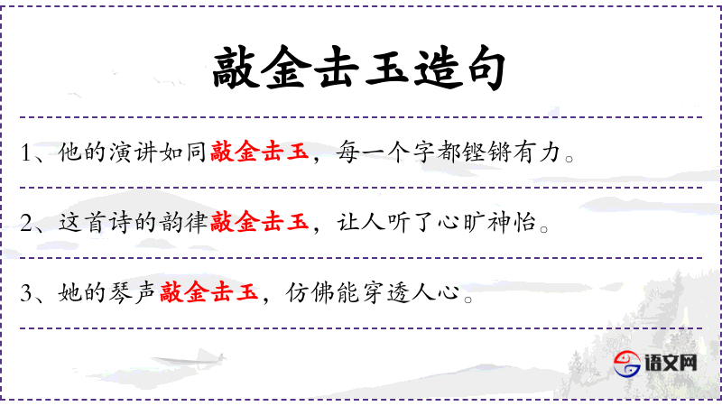 - 成语“敲金击玉”源自古代对音乐和诗歌的赞美,体现了对艺术的高度评价。
