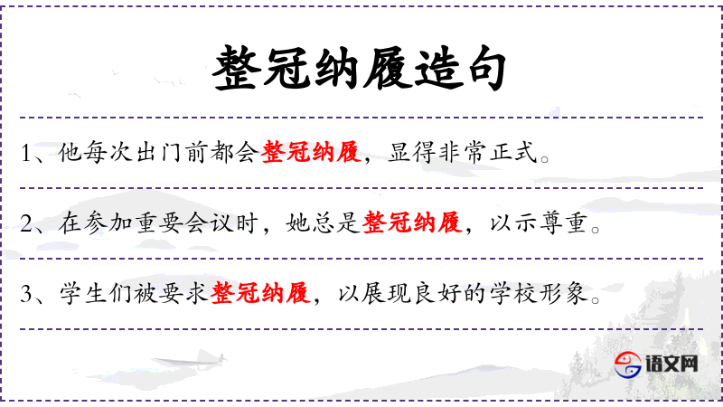 - 宾语:整冠纳履是对他人的基本礼貌