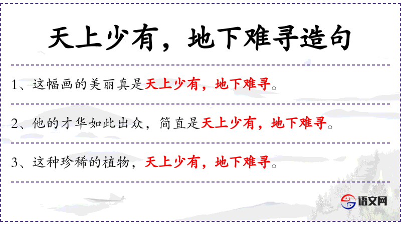 - 宾语:“天上少有,地下难寻”,由两个并列的短语组成,分别用“天上”和“地下”来比喻,强调这种特质极为罕见。