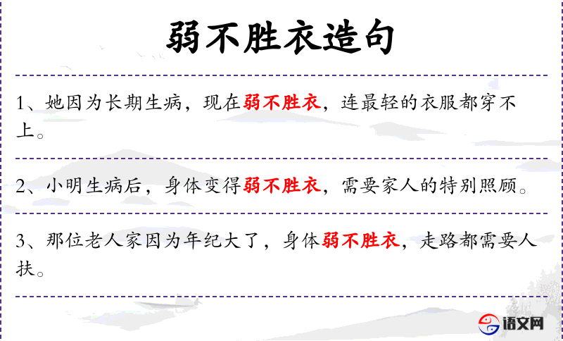 1. 【弱不胜衣】 胜:禁得起。形容人很瘦弱,连衣服都承受不起。