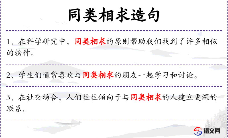 - 相关成语:“物以类聚,人以群分”,与同类相求的原则有相似的含义。