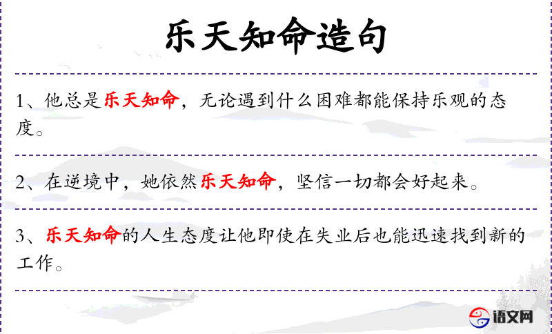 - 乐天知命:形容人性格乐观,顺应天命,不强求。