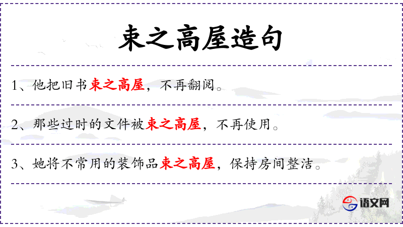 1. 【束之高屋】 - 捆起来以后放在高高的架子上。比喻放着不用。同“束之高阁”。