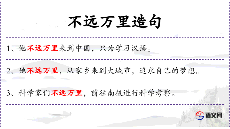 成语:不远万里,源自**古代文学,常用于形容不计较距离的远近,强调决心和毅力。
