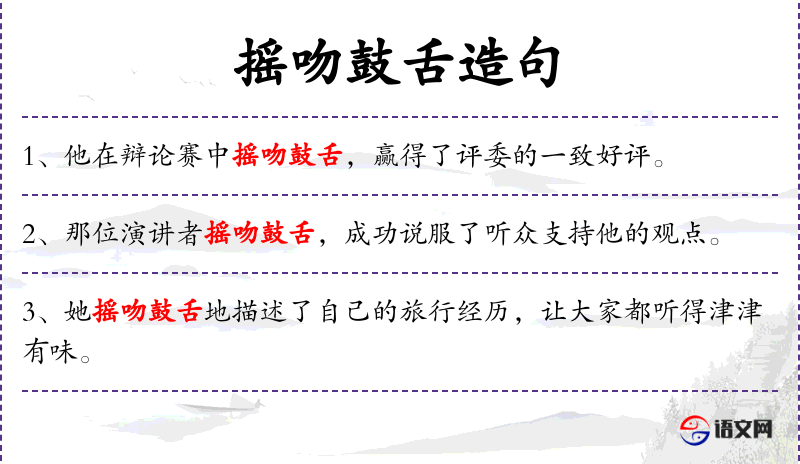 - “摇吻鼓舌”:这个成语形容说话滔滔不绝,能言善辩。