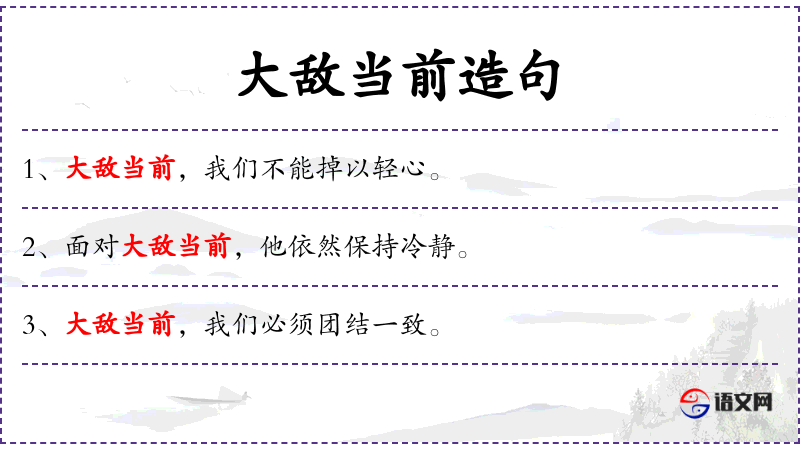 1. 【大敌当前】 当:面对。面对着强敌。形容形势严峻。