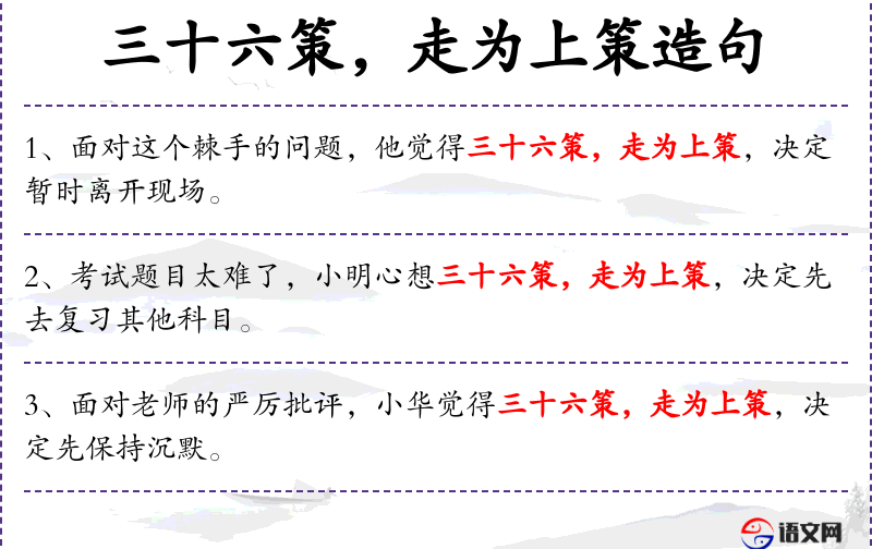 句子中的“三十六策,走为上策”是一个成语,源自古代的兵法,意味着在多种策略中,逃避或撤退有时是最明智的选择。这个成语反映了的战略思想和文化背景。