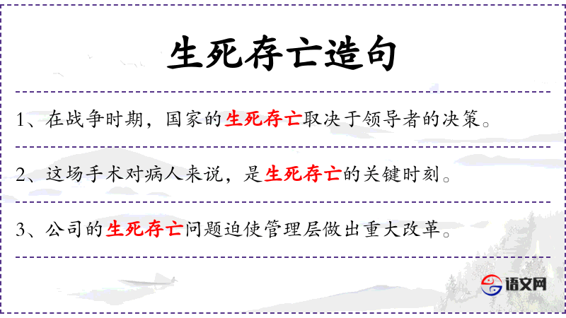 1. 【生死存亡】 - 生存或者死亡。形容局势或斗争的的发展已到最后关头。