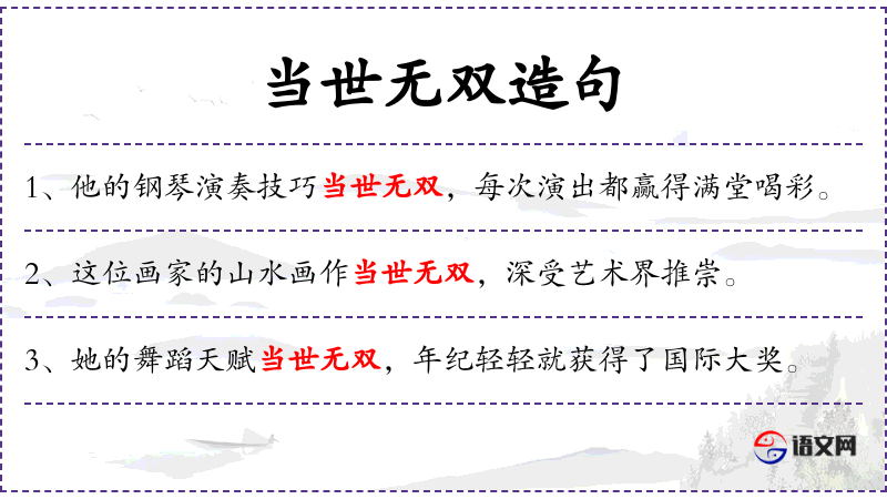 - 当世无双:意思是独一无二,没有可以与之相比的。