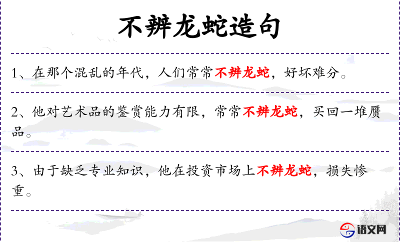 - 不辨龙蛇:这个成语源自**古代,龙代表吉祥、高贵,蛇代表阴险、狡诈,比喻难以区分好坏、真假。