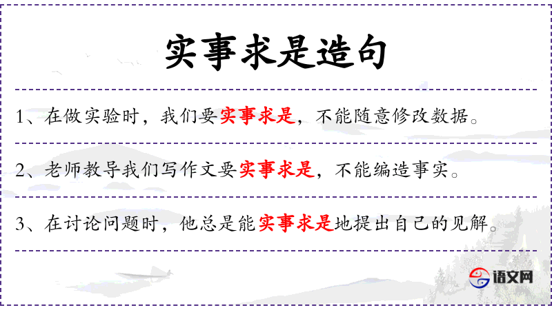 - 实事求是:指根据事实来研究或处理问题,不脱离实际。