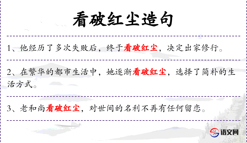 2. 【看破红尘】 - 旧指看透人生,把生死哀乐都不放在心上的消极的生活态度。现也指受挫折后消极回避、无所作为的生活态度。