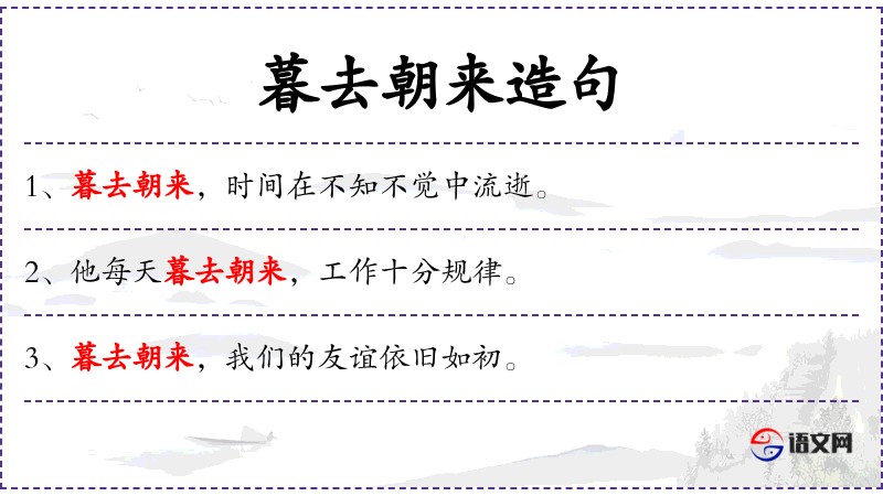 2. 【暮去朝来】 - 黄昏过去,清晨又到来。形容时光流逝。
