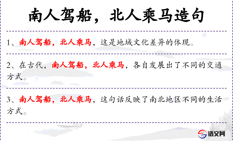 句子:“南人驾船,北人乘马,这句话常用来比喻不同地区有不同的特长和*惯。”