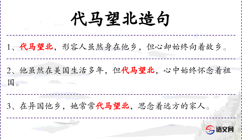 - 代马望北:这是一个成语,意思是比喻思念家乡。