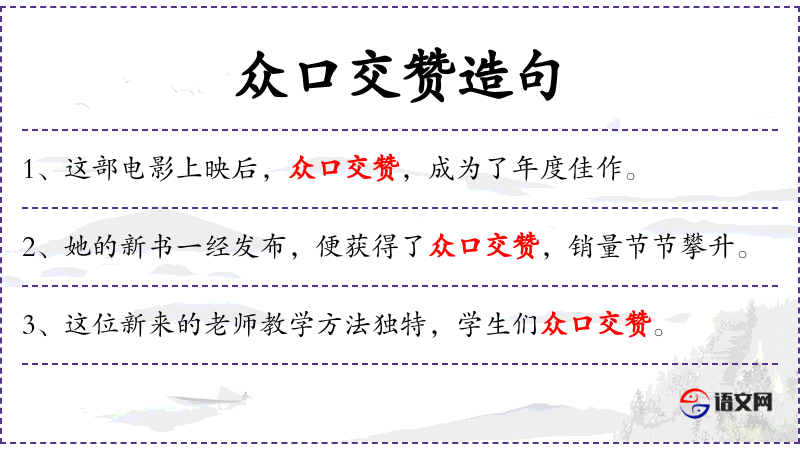 句子:“这部电影上映后,众口交赞,成为了年度佳作。”