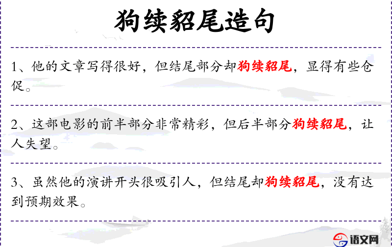 5. 【狗续貂尾】 - 指封官太滥。亦比喻拿不好的东西补接在好的东西后面,前后两部分非常不相称。同“狗尾续貂”。