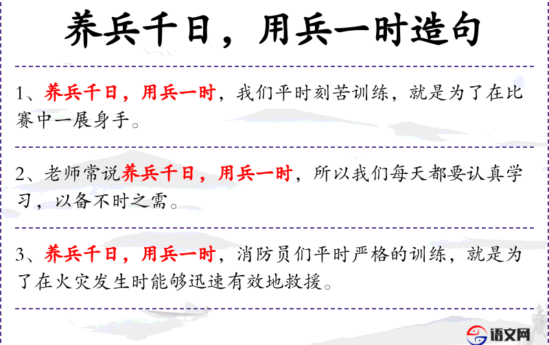 - 养兵千日,用兵一时:这是一个成语,意思是平时长时间的准备和训练,是为了在关键时刻能够发挥作用。