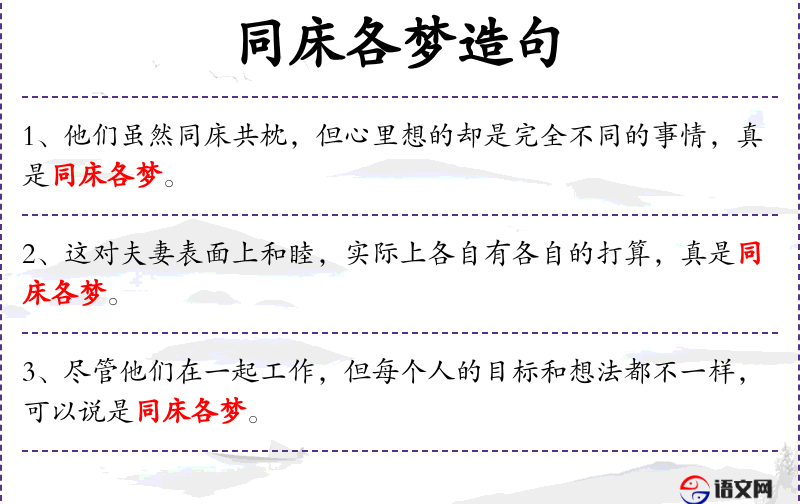 - 同床各梦:成语,比喻虽然在一起,但各有各的想法或目标。