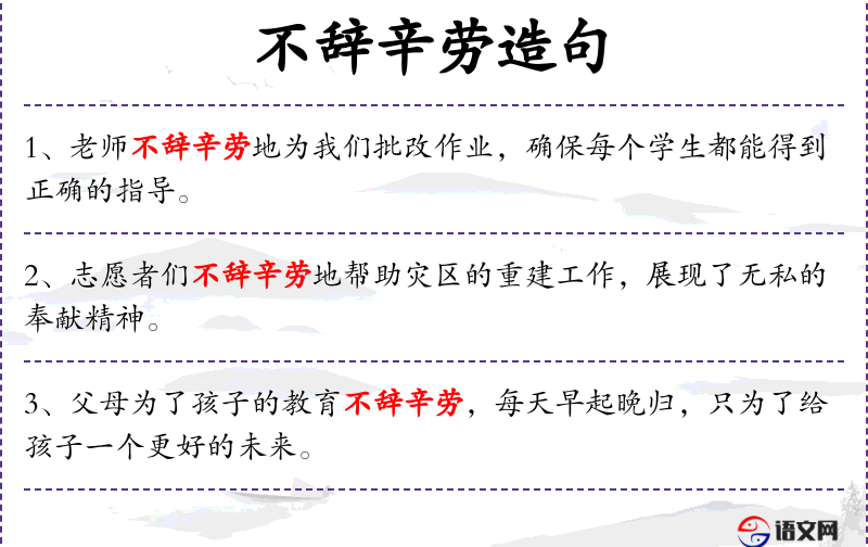 1. 【不辞辛劳】 - 辞:推辞。虽然劳累和辛苦也不推辞,形容工作勤奋努力