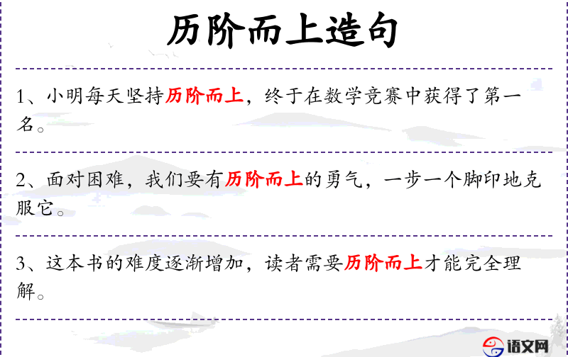 - 历阶而上:比喻克服困难,逐步提升。