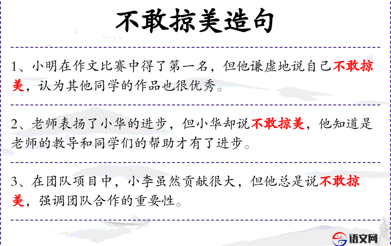 - 礼貌用语:“不敢掠美”是一种礼貌的表达方式,显示了小强的谦逊和对他人的尊重。
