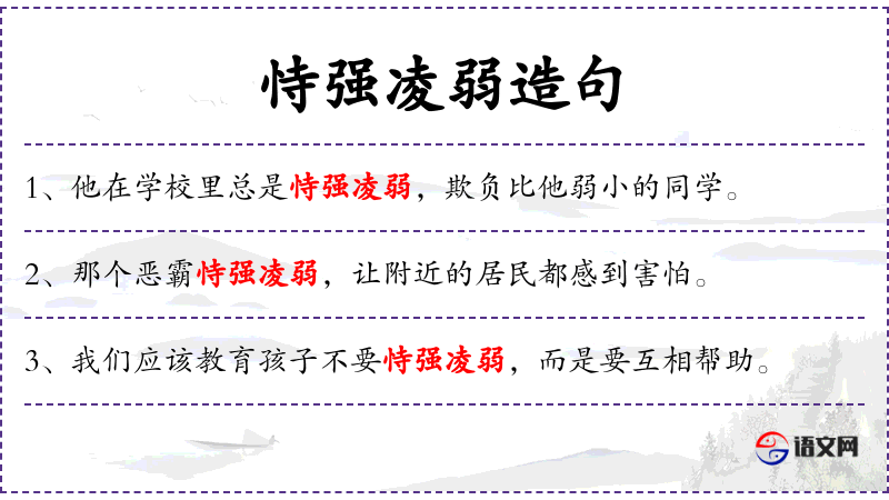 - 恃强凌弱:指利用自己的强势欺负弱小的人,是状语的一部分。