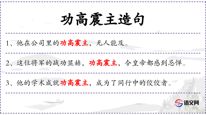 - 相关成语:“功高震主”是一个成语,源自**古代的历史典故,用来形容臣子的功绩过大,以至于影响到君主的地位。