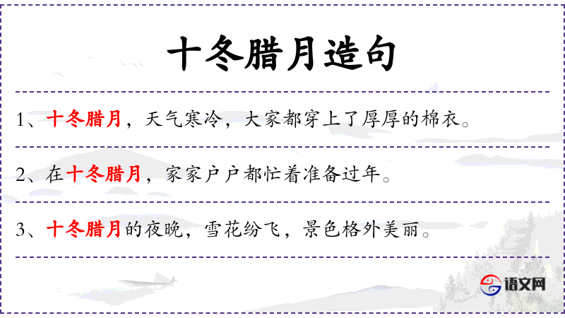 句子中的“十冬腊月”和“年货”反映了*农历新年的俗。在**,新年是一个重要的节日,人们会提前准备各种食物和装饰品,以迎接新年的到来。