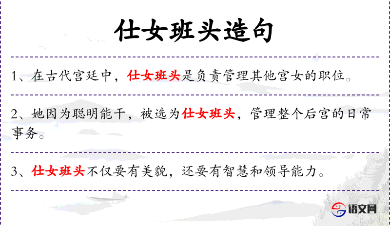 - “仕女班头之职,使她每日必须检查宫女的仪容仪表。”