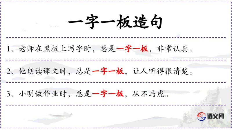 - 一字一板:成语,形容做事认真、一丝不苟。