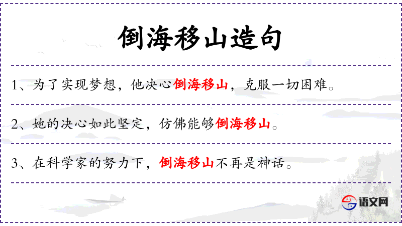 - 倒海移山:这个成语源自**古代神话,常用来形容极大的力量和决心。