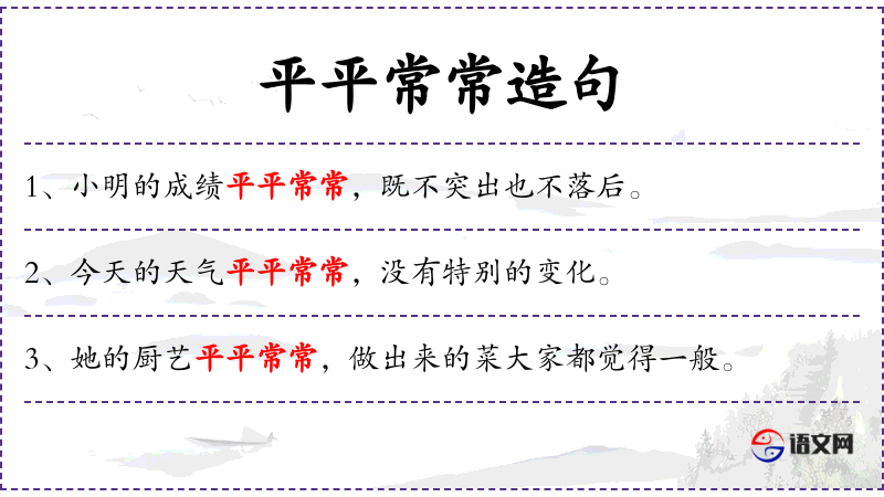 - 平平常常:表示普通、不特别,同义词有“普通”、“一般”,反义词有“非凡”、“特别”。