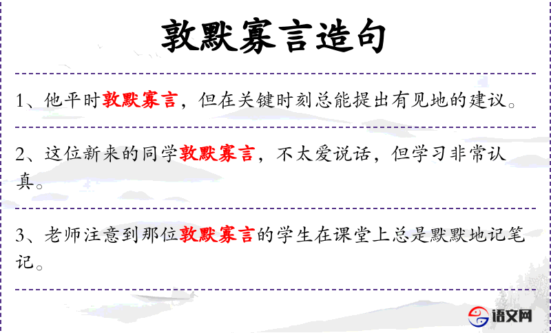 - 敦默寡言:形容词短语,意为“说话不多,沉默寡言”。