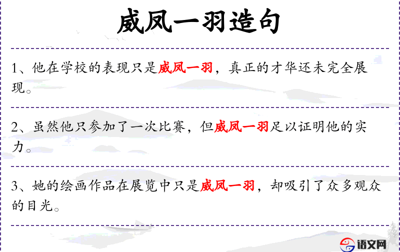 - 威凤一羽:这是一个成语,比喻事物虽小却有极大的影响力或价值。